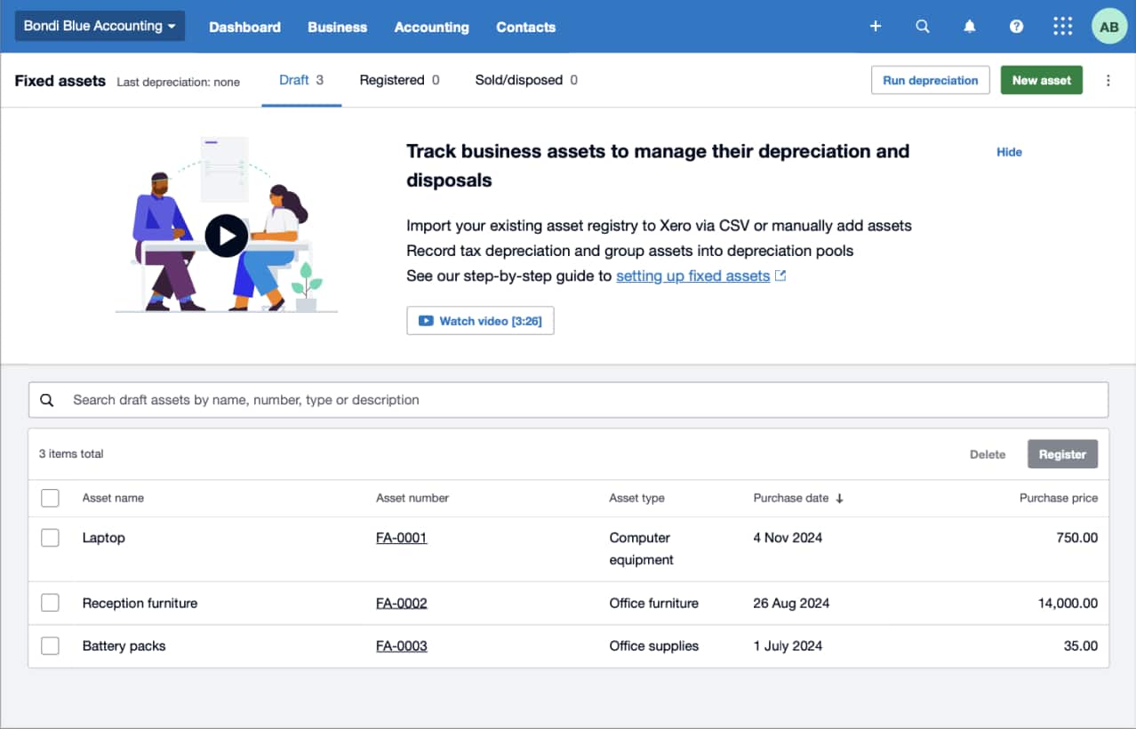 See Xero’s glossary page on fixed assetsA fixed asset register is a list of all the physical resources your business owns, such as land, buildings, vehicles, and office equipment. It has information on each asset’s original cost, location, life expectancy, and other relevant details. Maintain an accurate register so your business can keep track of its assets’ values.